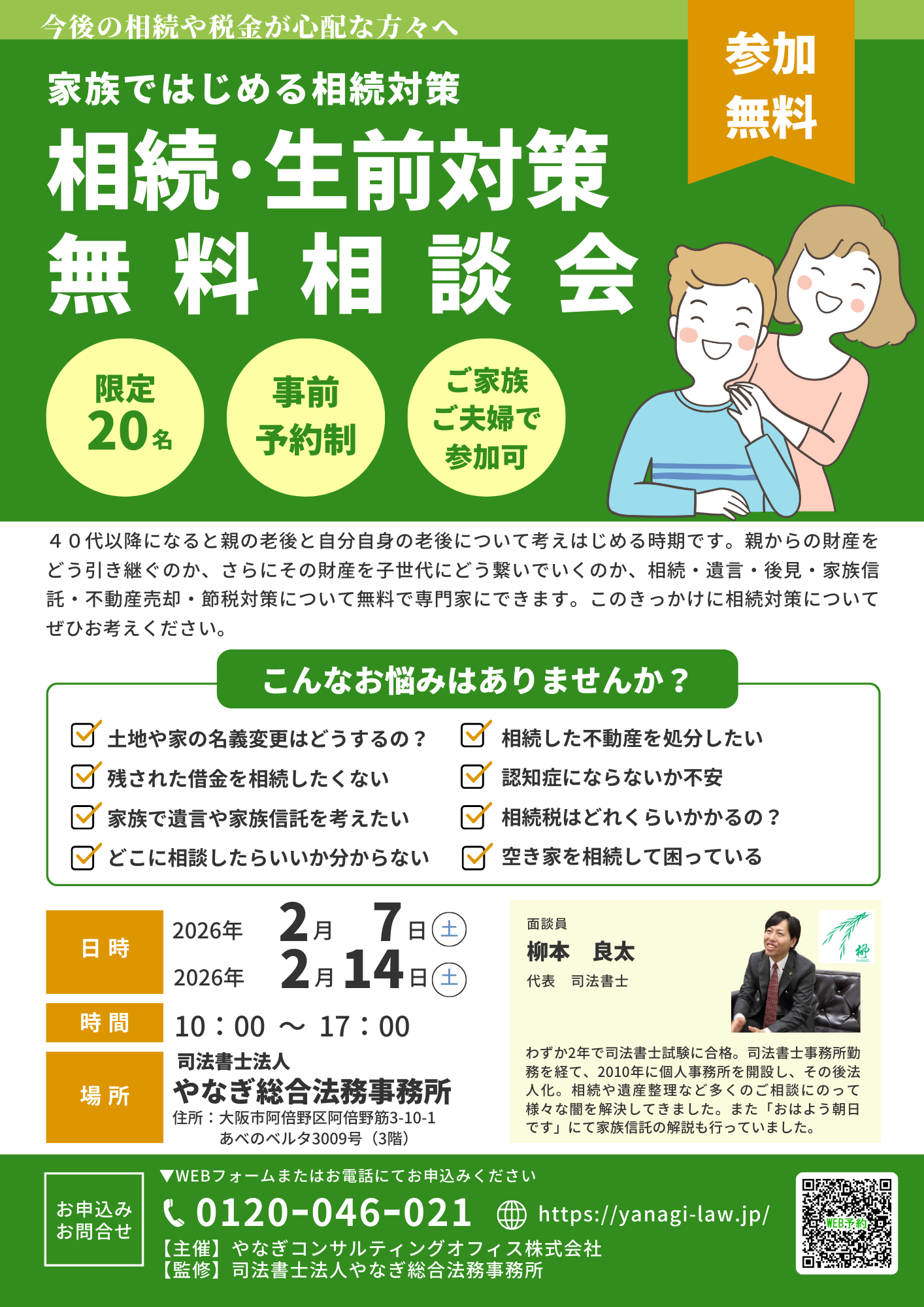 個別無料相談会を弊所『司法書士法人やなぎ総合法務事務所』にて開催いたします。